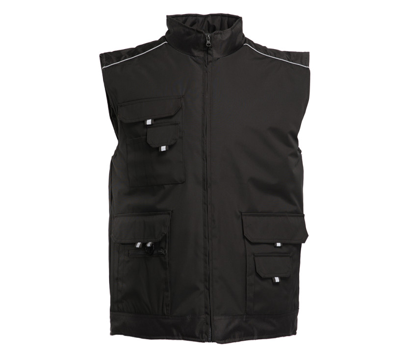 Empiècement épaules, col et partie basse avant en oxford 330D. Coupe-vent et imperméable. 11 poches extérieures (1 poche zippée devant, 4 poches Velcro®, 2 poches latérales, 3 poches stylos, 1 poche téléphone). Bandes réfléchissantes épaules et poches. Accès personnalisation. Existe en blouson Réf. PK542 page 286.