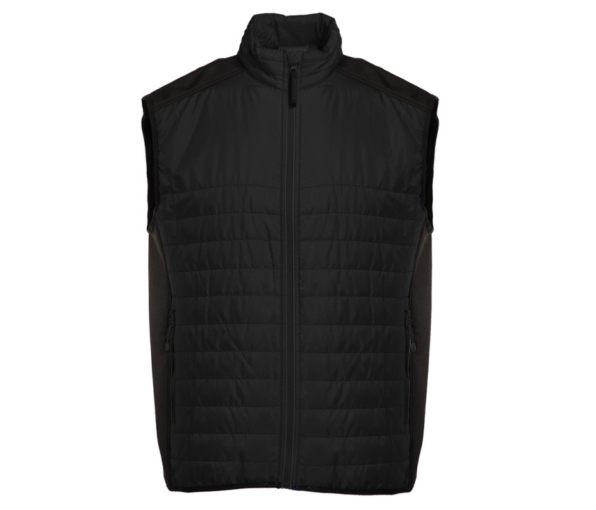 Bodywarmer bi-matière déperlant et coupe-vent. Coupe et look moderne. Accès marquage cœur. 2 poches zippées latérales. Ourlet réfléchissant sur les zips. Dos entièrement noir.