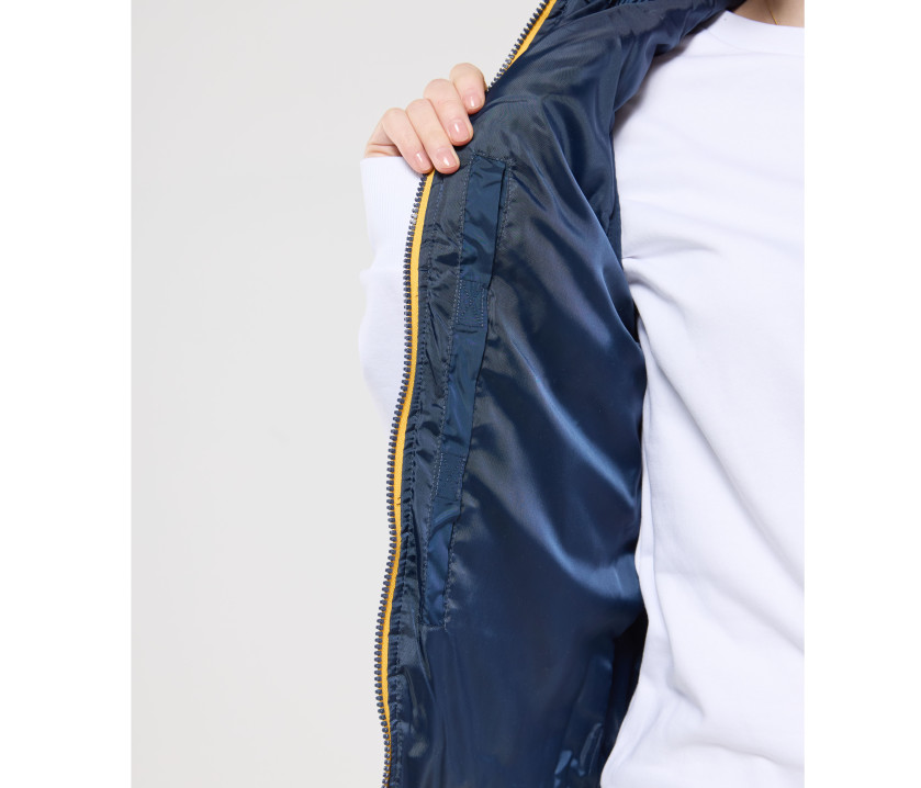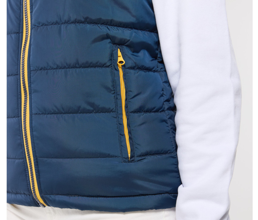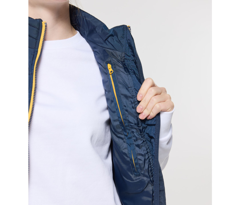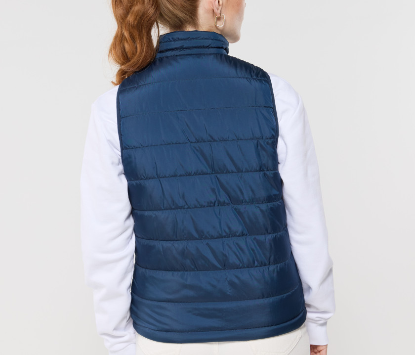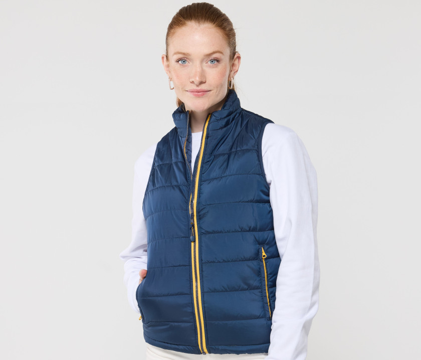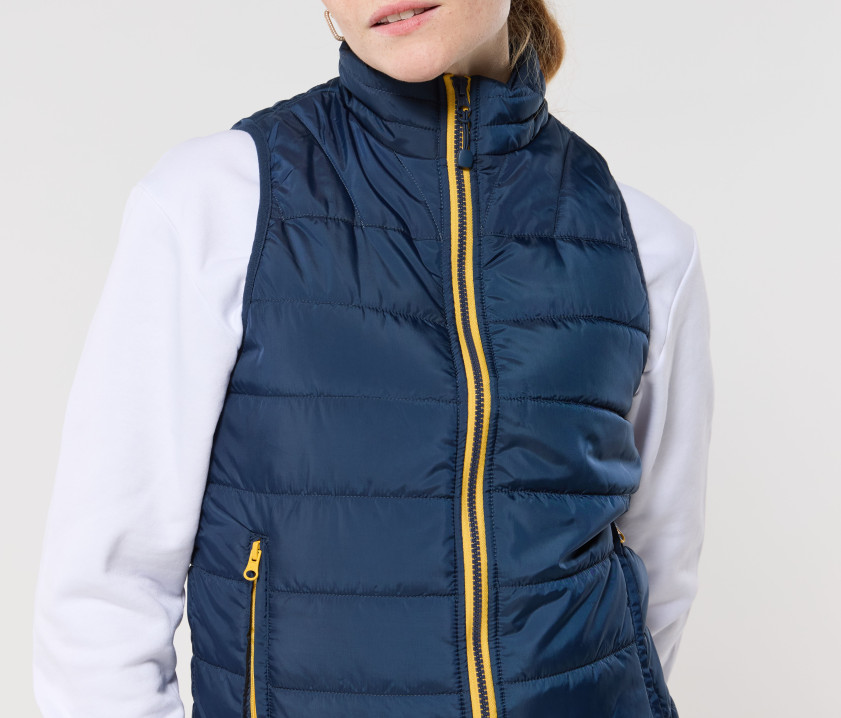Bodywarmer tendance femme - Grand zip avec une poche intérieure gauche pour marquage. Possibilité de ranger totalement le bodywarmer dans la poche intérieure droite avec fermeture Velcro®. 2 poches latérales zippées avec rabat.