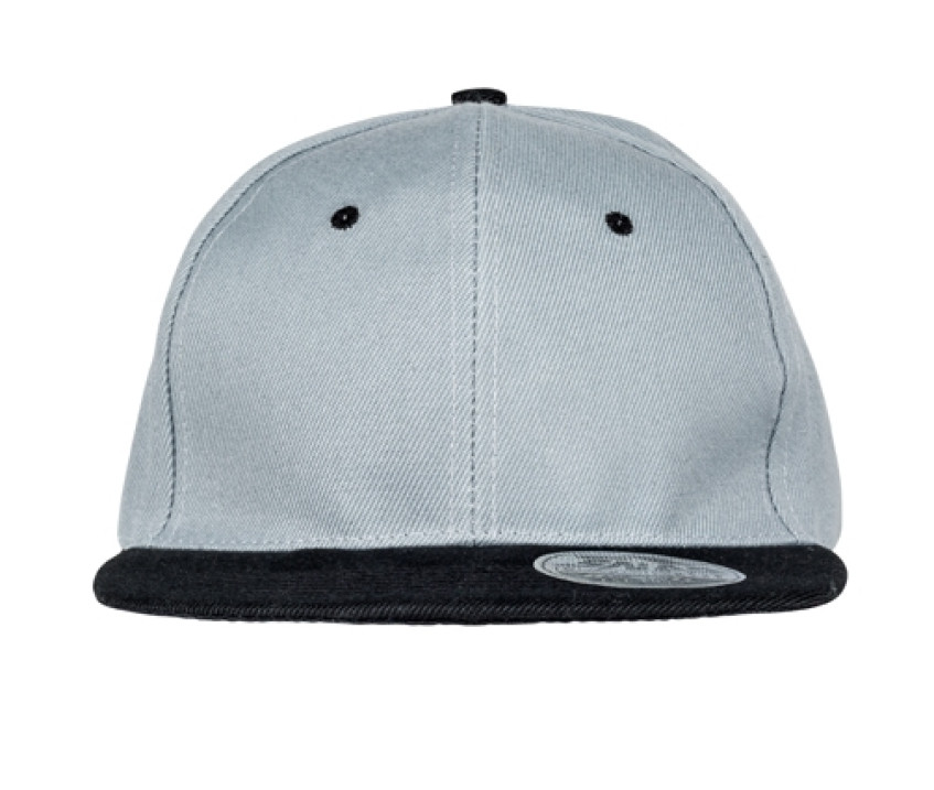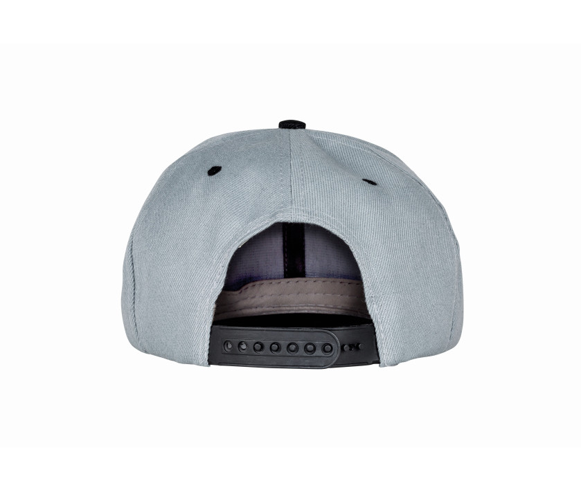 6 panneaux. Panneaux frontaux renforcés. Visière plate avec 6 surpiqûres. Visière, œillets et bouton de couleur contrastée. Ajustable par picots. Étiquette détachable. Sticker sur la visière. Style rétro. Tour de tête 57cm.