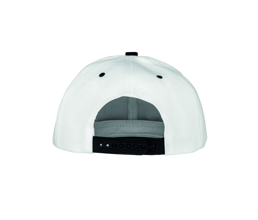 6 panneaux. Panneaux frontaux renforcés. Visière plate avec 6 surpiqûres. Visière, œillets et bouton de couleur contrastée. Ajustable par picots. Étiquette détachable. Sticker sur la visière. Style rétro. Tour de tête 57cm.