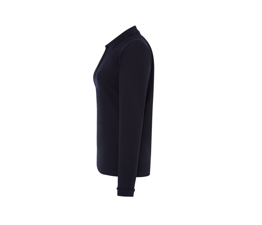 Polo manches longues femme 200 - Maille piquée. Plaquette 3 boutons ton sur ton. Fentes latérales.