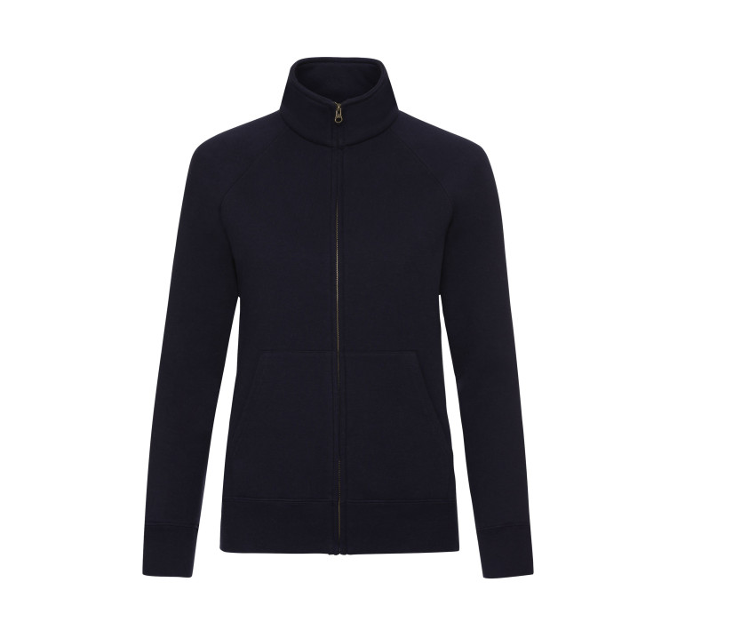 Sweat zippé femme. Zip invisible pour une impression harmonieuse. Col montant. Deux poches. Taille et poignets en bord côte coton/élasthanne. Grand zip ton sur ton.