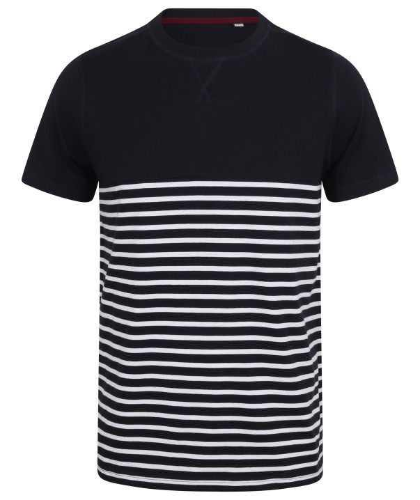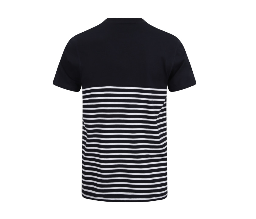 Marinière manches courtes, coupe droite. Sans étiquette. Col rond en bord côte stretch. Double sûrpiqûre manches et bas. Coutures en V au col. Manches longues Réf. FR134.