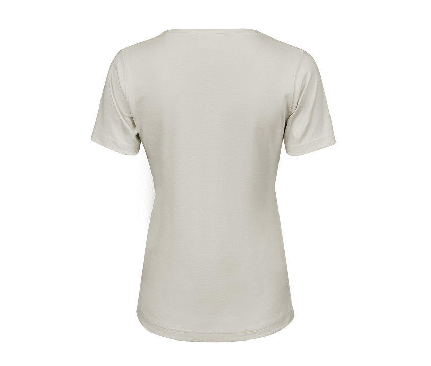 Tee-shirt femme - Coupe ajustée. Col en bords côte. Double couture. Lavé aux enzymes.