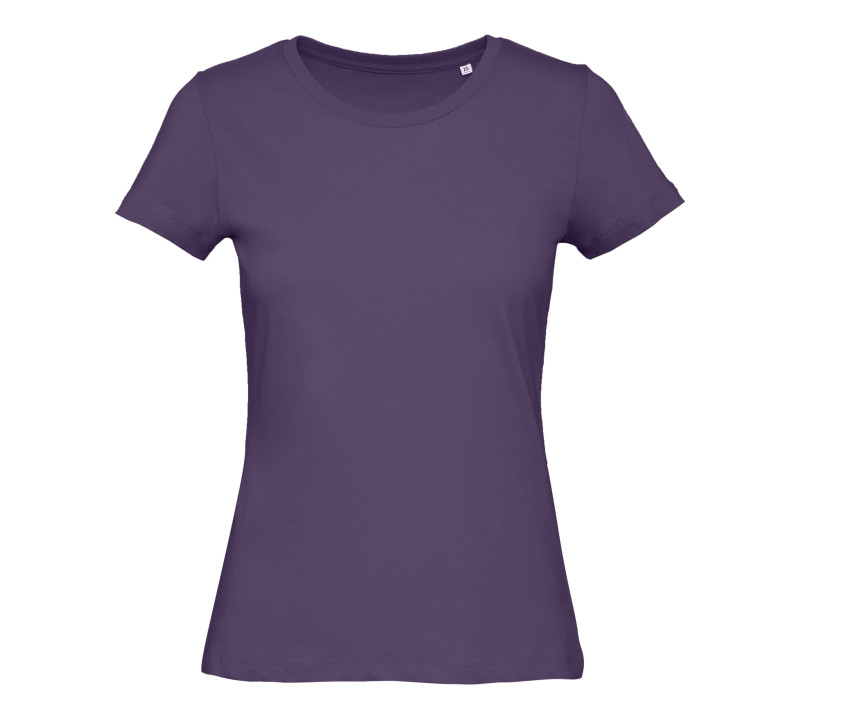 Tee-shirt femme coton bio ou bio en conversion. Coupe cintrée. Manches courtes. Coutures latérales. Doux au toucher. Col en côtes fines. Renfort d'épaule à épaule. Surface lisse pour une impression nette et précise.