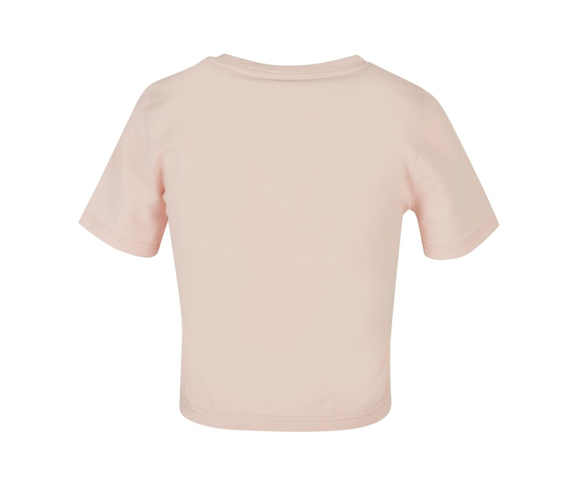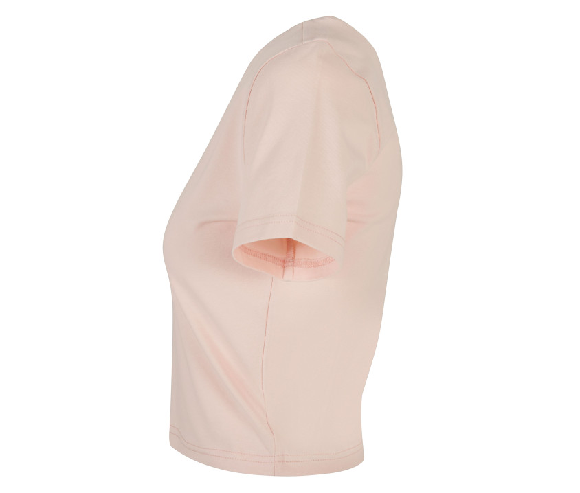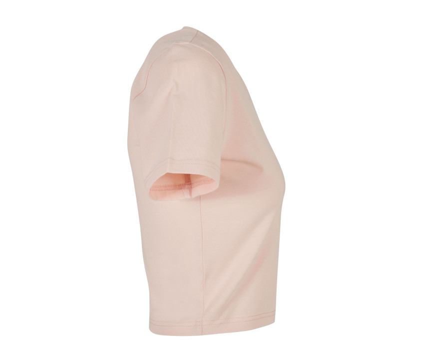 Tee-shirt court. Sans étiquette de marque, uniquement une puce de taille. Coutures latérales. Manches droites. Maille jersey. Impression possible dans le cou. Coupe moderne.