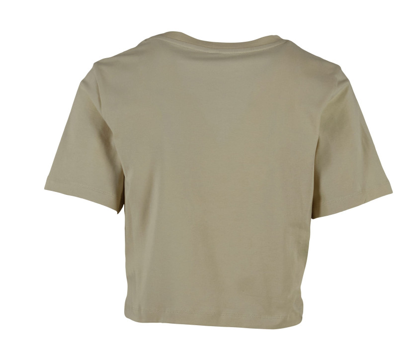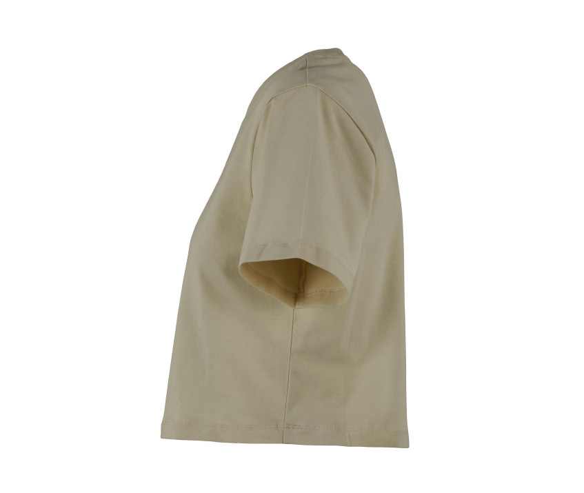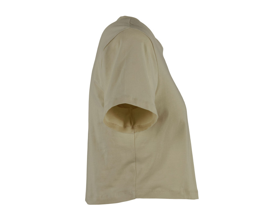 Tee-shirt court. Sans étiquette de marque, uniquement une puce de taille. Coutures latérales. Manches droites. Maille jersey. Impression possible dans le cou. Coupe moderne.