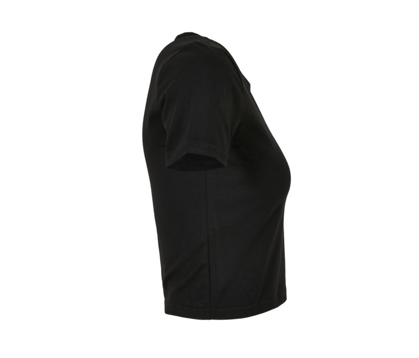 Tee-shirt court. Sans étiquette de marque, uniquement une puce de taille. Coutures latérales. Manches droites. Maille jersey. Impression possible dans le cou. Coupe moderne.