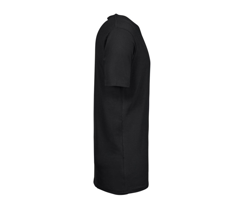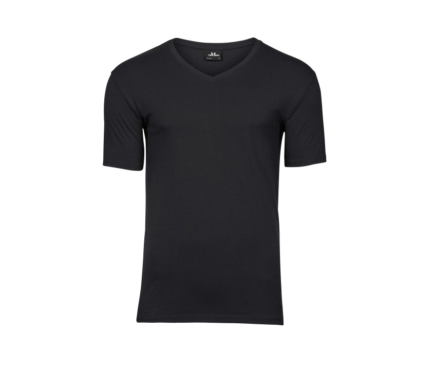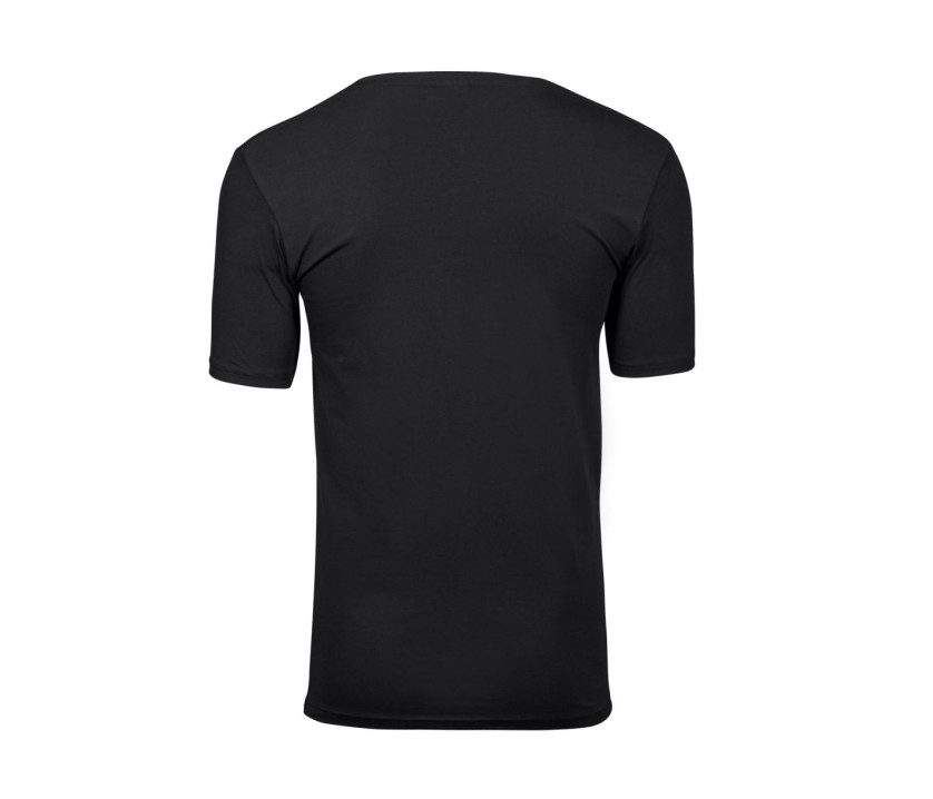 Tee-shirt homme col V stretch. Col doublé en bords côte. Epaules renforcées. Bande de propreté. Pré-rétréci. Double coutures. Lavé aux enzymes et au silicone.