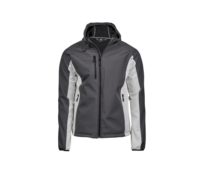 Veste Softshell à capuche bicolore. Coupe ajustée. 2 poches frontales. Capuche et taille ajustables. Poche poitrine. Poignets élastiqués. Imperméable à 8000 mm. Respirant à 6000 gr. Coupe-vent.