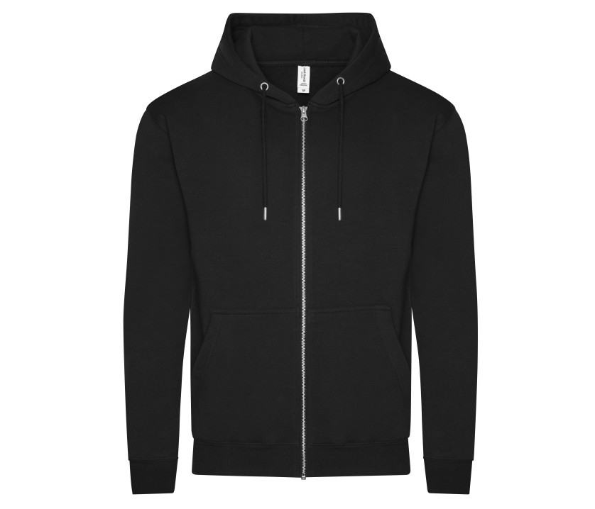 Sweat-shirt zippé à capuche. Fermeture Éclair YKK métallique couverte. Double couture. Capuche doublée avec cordons de serrage ton sur ton. Poches kangourou. Intérieur brossé. Étiquette détachable. Taille et poignets en bords côte. Surface douce pour un rendu d'impression idéal. Usine et fil certifiés.
