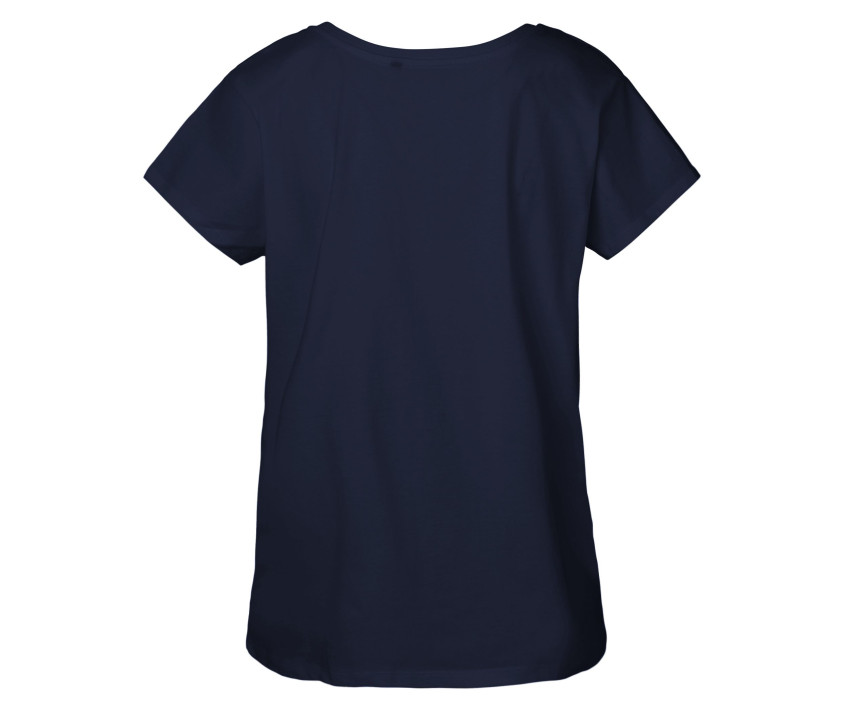 Tee-shirt femme manches courtes. Coupe ample. Col évasé. Col rond. Bande de propreté au col. Certifié Fairtrade, EU Ecolabel, SA8000 et Oekotex. Produit avec de l'énergie éolienne.