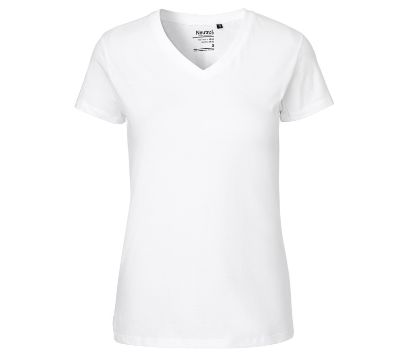 Tee-shirt femme manches courtes. Coupe moderne. Col V. Bande de propreté au col. Certifié Fairtrade, EU Ecolabel, SA8000 et Oekotex. Produit avec de l'énergie éolienne.