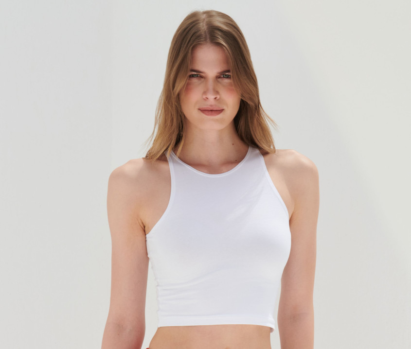 Tee-shirt court. Dos et avant style nageur. Doubles coutures col, emmanchures et taille. Étiquette détachable.