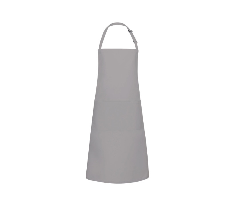 Tablier à bavette avec lanières faits du même tissu que le tablier. Coutures renforcées. Longueur lanières réglage jusqu'à 70 cm. Lanières avec boucles. Poche plaquée avec 2 compartiments (40 x 20 cm). Dimensions : 75x90cm.