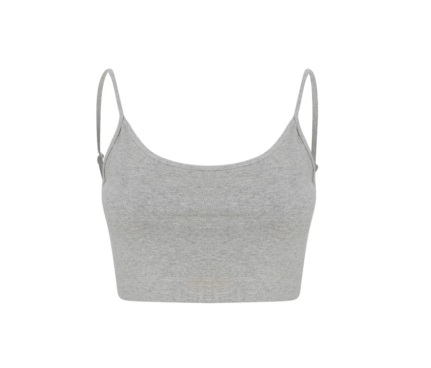 Bretelles spaghetti ajustables. Col et emmanchures arrondis. Avant doublé avec support poitrine invisible. Bande élastiquée en bas du tee-shirt. Sans étiquette de marque.