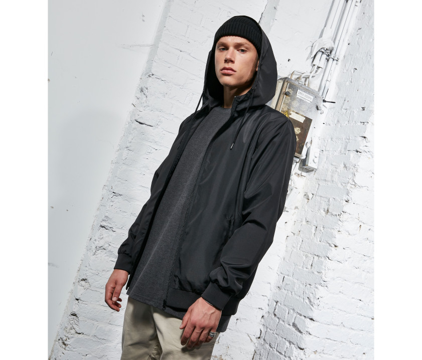 Coupe-vent léger. Partiellement produit avec des fibres recyclées. Coupe classique. Intérieur filet respirant. Bords côte à la taille et aux poignets. Grand zip. Capuche ajustable.