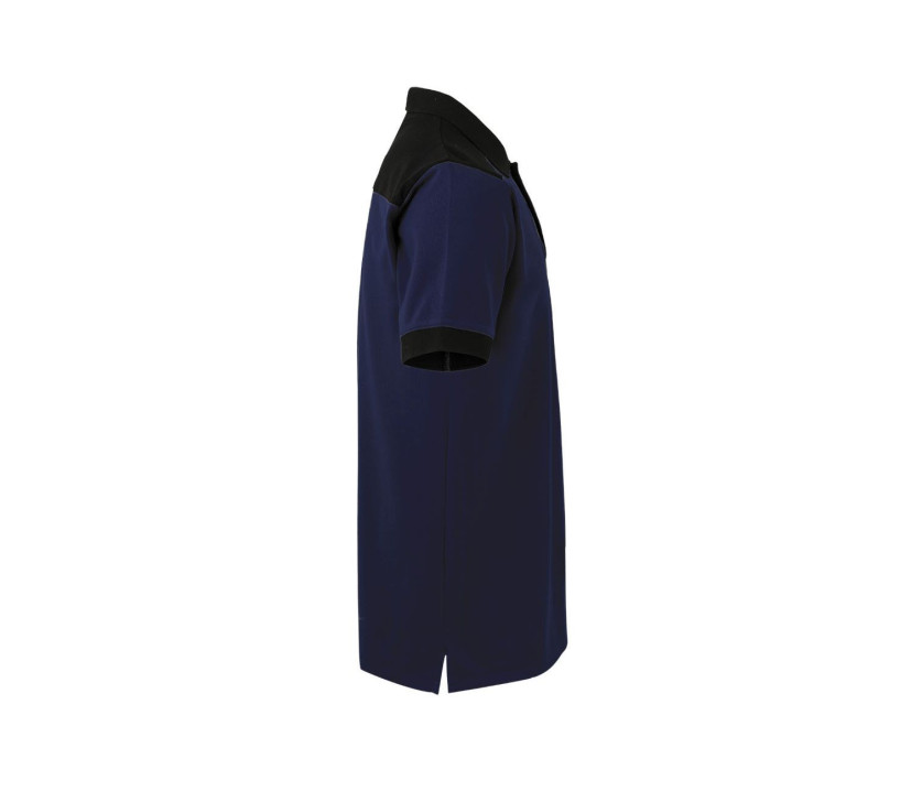 Plaquette 3 boutons. Maille piquée. Col et emmanchures en bords côte contrastés. Fentes latérales. Empiècement au dos, épaules, boutons et intérieur de la patte de boutonnage contrastés.