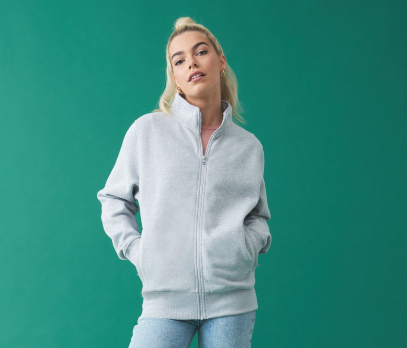 Fermeture zippée en plastique YKK. Panneaux latéraux en bord côte. Poignets et taille en bord côte. Intérieur brossé. Tissu avant en coton doux. Étiquette détachable.