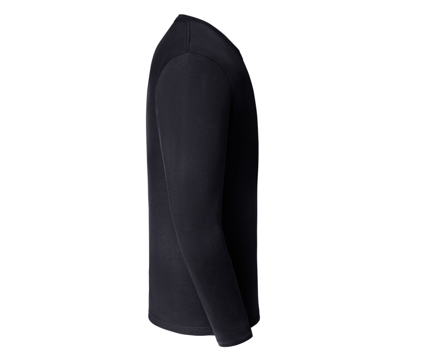 Coupe classique et tubulaire. Bande de propreté au col. Col en bord côte 1x1. Matière dense et stable.
