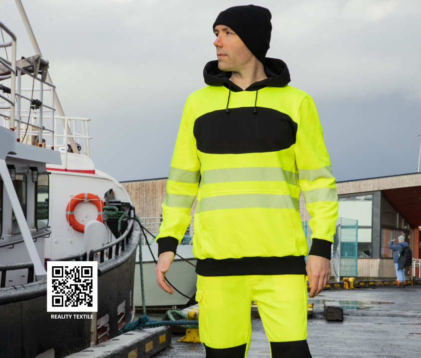 Certifié EN ISO 20471:2013/A1:2016, classe 3. 2 bandes réfléchissantes de 5 cm de large au corps et aux manches. Col et poignets noirs en bord côte. Grande zone d'impression sur la poitrine. Intérieur de la capuche doublé et contrasté. Poche kangourou. Propriétés réfléchissantes selon la norme EN garanties pour 25 cycles de lavage à 60°C.