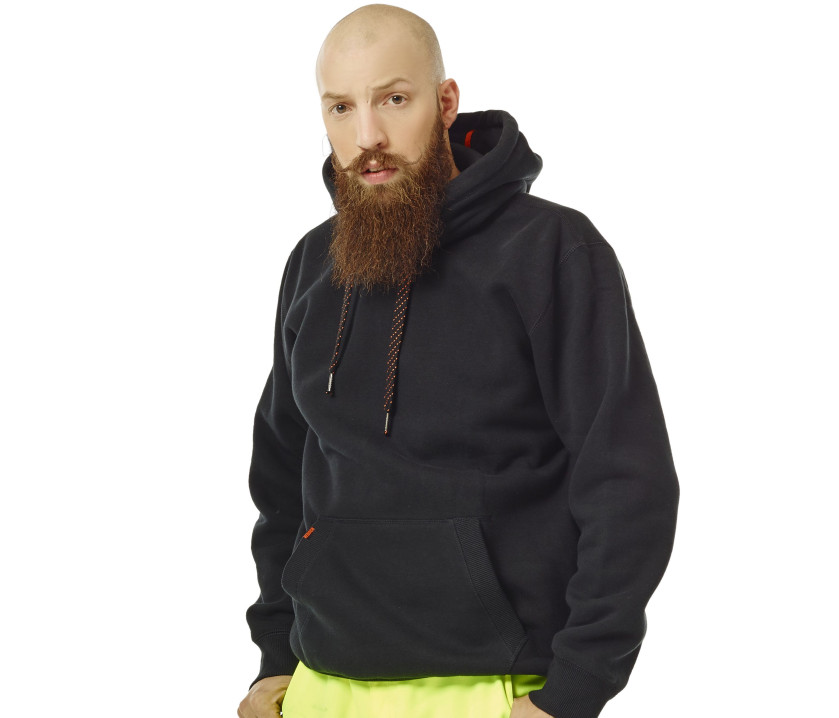 Poche kangourou. Poignets et taille en bord côte. Capuche avec gros cordon de serrage.