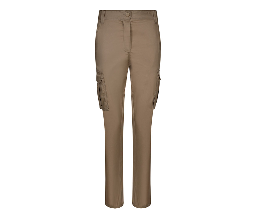 Coupe cintrée. Fermeture zippée avec bouton. Coutures contrastées. Taille élastiquée. Double couture de sécurité. 6 poches : 2 poches sur les côtés, 2 poches à soufflet avec rabat et Velcro®, 2 poches arrière.