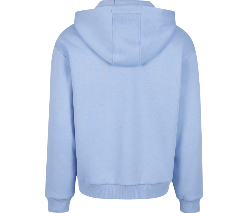 Coupe oversize. Épaules tombantes. Poche kangourou. Rib aux poignets et taille. Fermeture éclair en métal. Intérieur brossé.