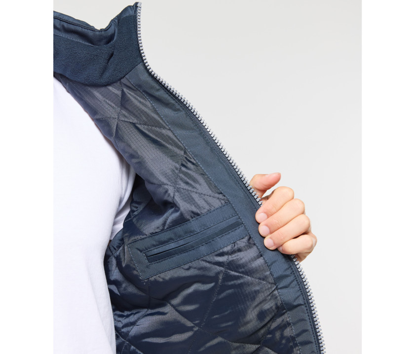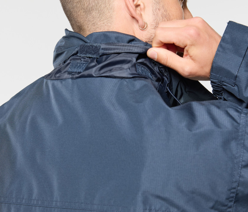 - Coupe-vent respirant et imperméable. Capuche dans le col. 1 poche poitrine et 2 poches latérales zippées.
