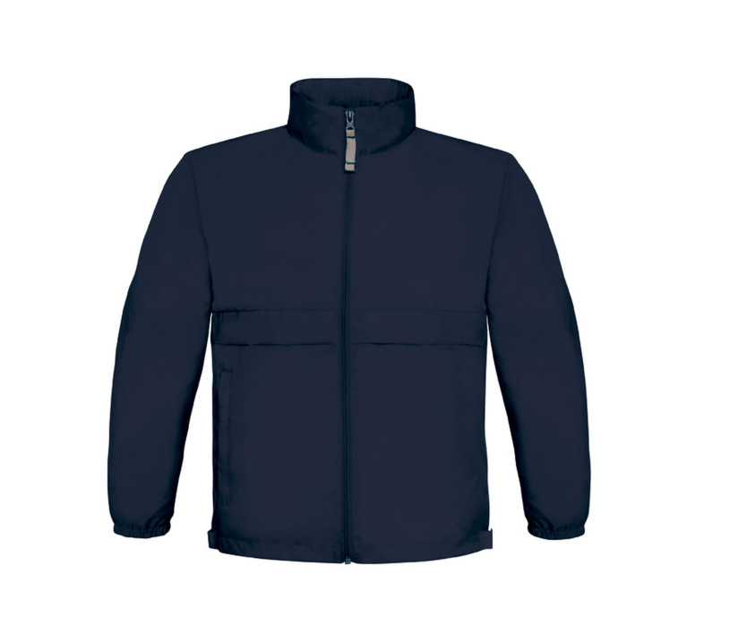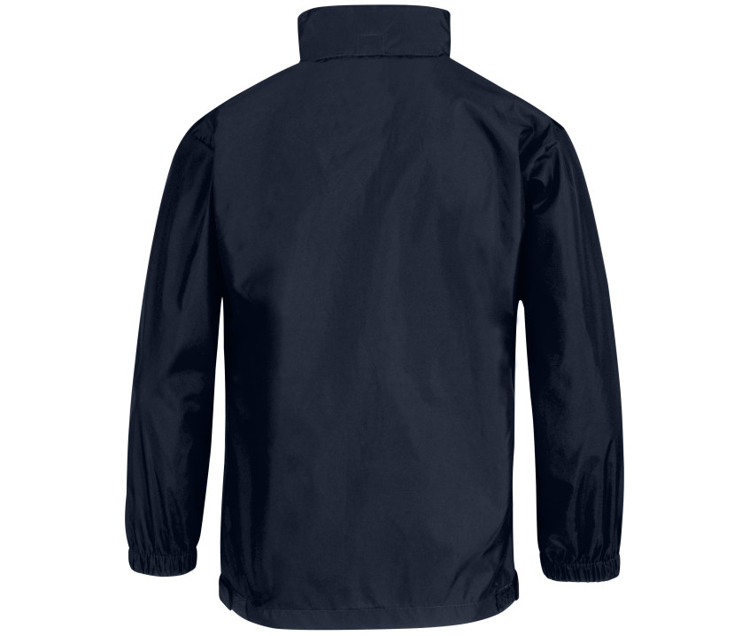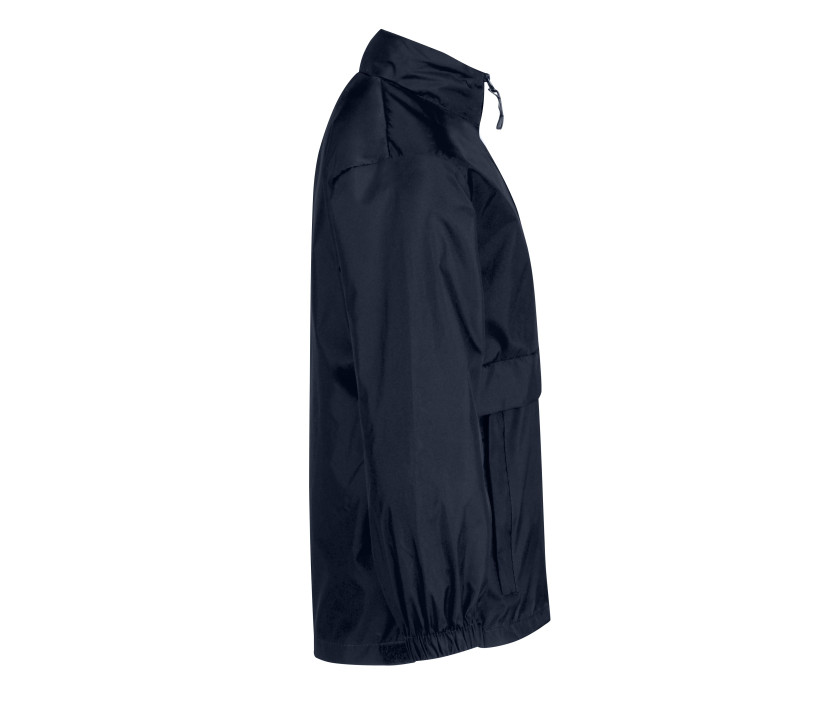 Fermeture zippée. Capuche dans le col. Veste imperméable et coupe-vent, repliable dans une poche centrale.