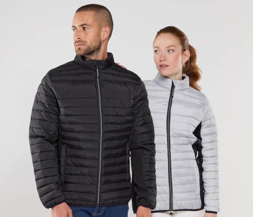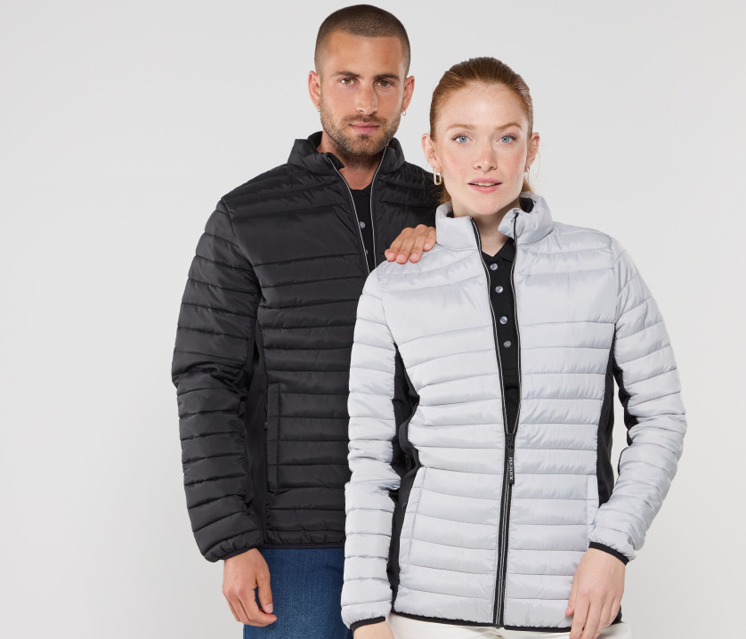 Doudoune légère moderne bi-matière, coupe ajustée. 2 poches latérales zippées. 2 poches intérieures. Protège menton. Zips contrastés. Dimension zone de marquage avant 9cm et 12cm à l’arrière.