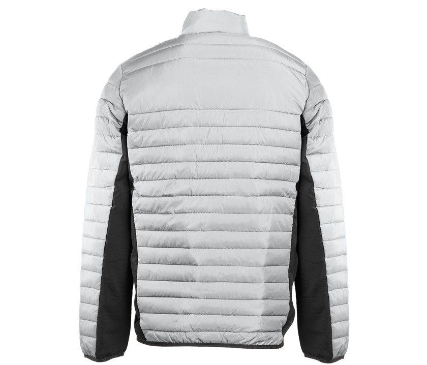 Doudoune légère moderne bi-matière, coupe ajustée. 2 poches latérales zippées. 2 poches intérieures. Protège menton. Zips contrastés. Dimension zone de marquage avant 9cm et 12cm à l’arrière.