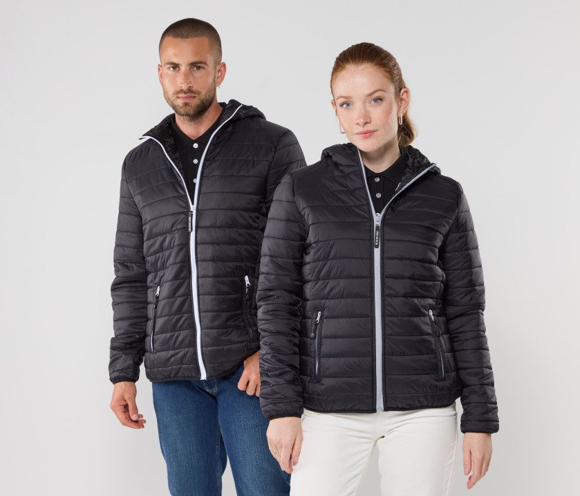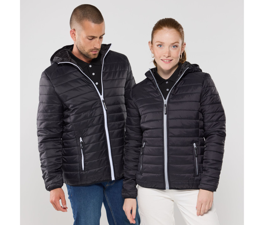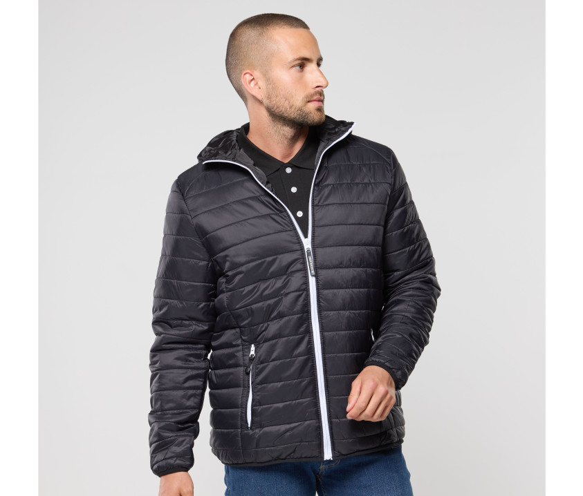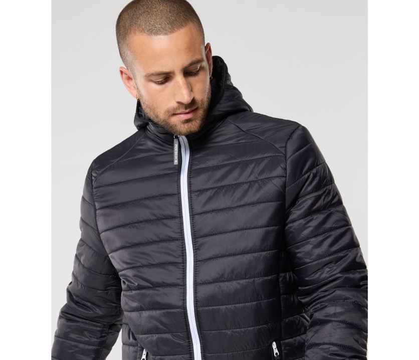 Doudoune avec capuche. Coupe-vent et déperlant. 2 poches latérales avec languette. Grande poche intérieure zippée. Poche intérieure Velcro®. Poignets et ourlet élastiqués. Hauteur entre les coutures : 4cm.