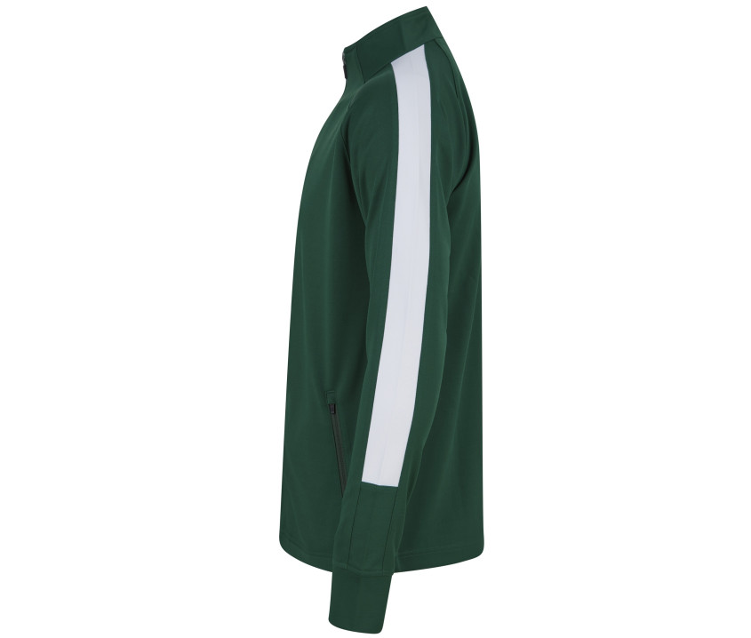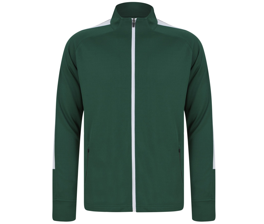 Veste grand zip contrasté. Bandes contrastées épaules et manches. Poches latérales zippées. Poignets en bords côte 1x1. Col cheminée.