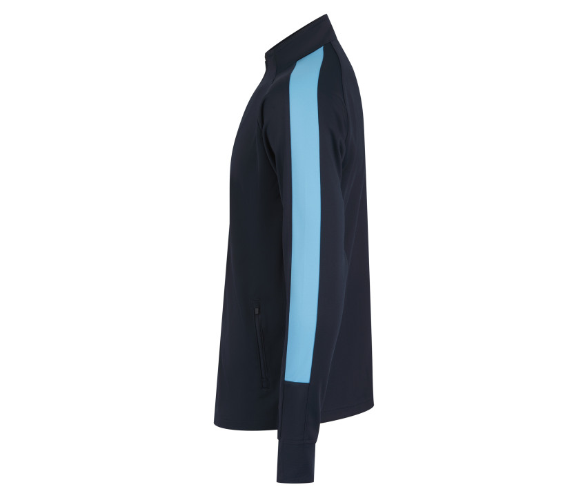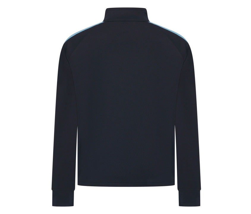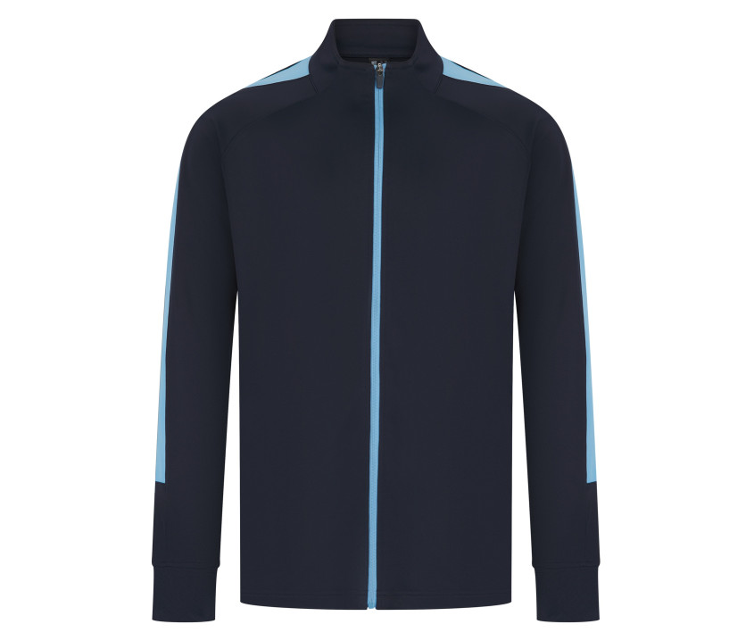 Veste grand zip contrasté. Bandes contrastées épaules et manches. Poches latérales zippées. Poignets en bords côte 1x1. Col cheminée.