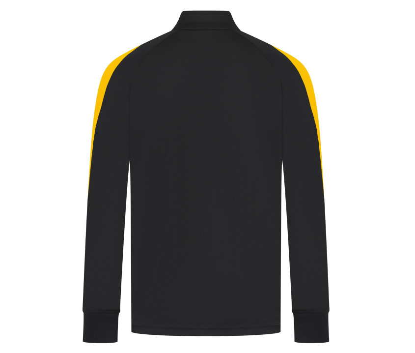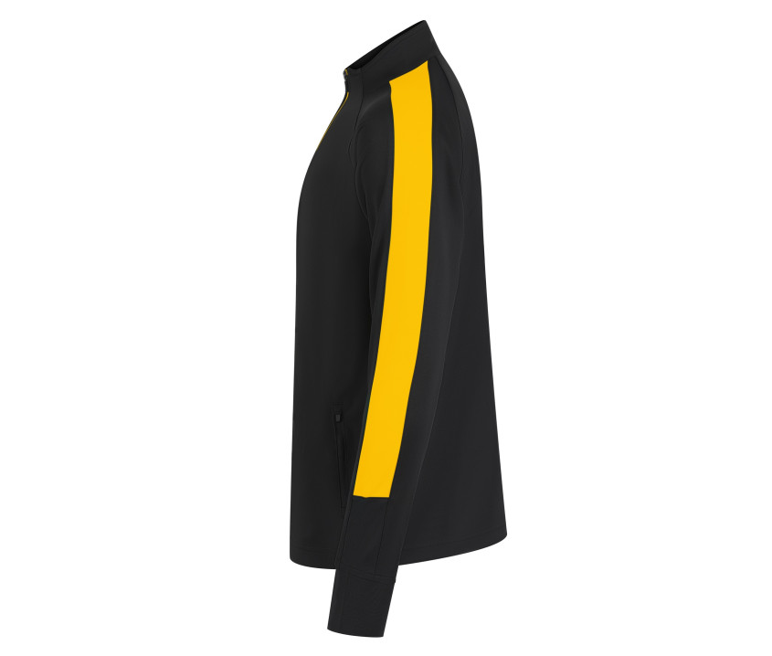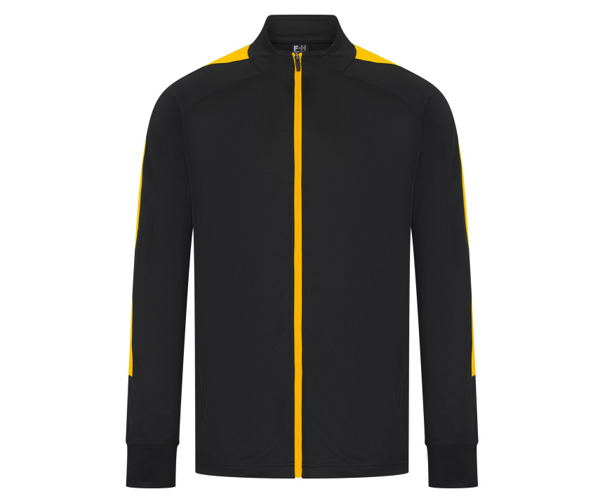Veste grand zip contrasté. Bandes contrastées épaules et manches. Poches latérales zippées. Poignets en bords côte 1x1. Col cheminée.
