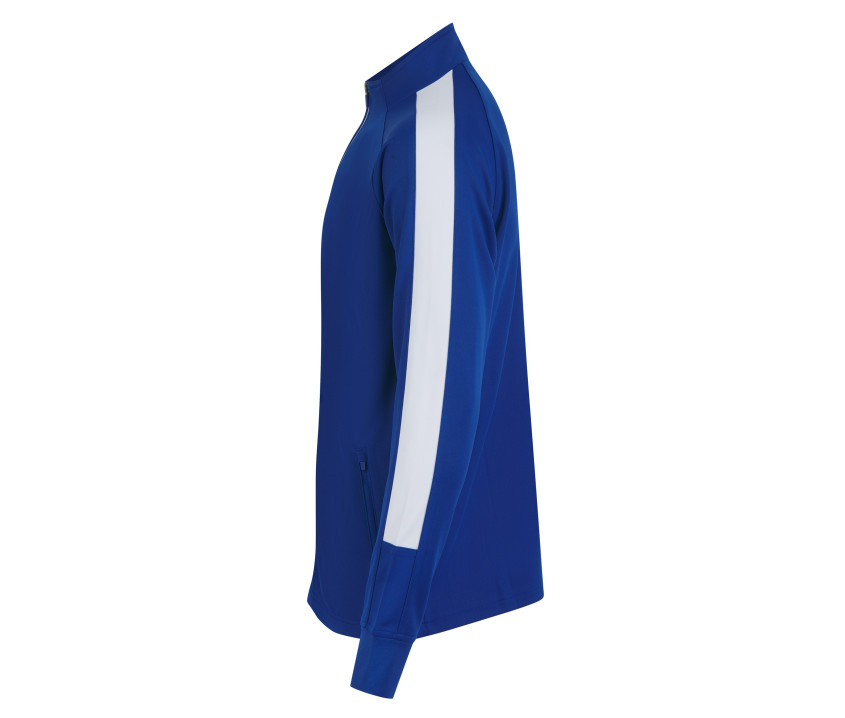 Veste grand zip contrasté. Bandes contrastées épaules et manches. Poches latérales zippées. Poignets en bords côte 1x1. Col cheminée.