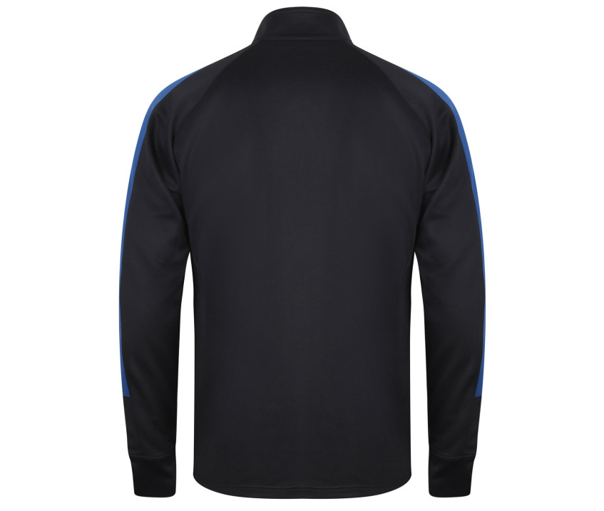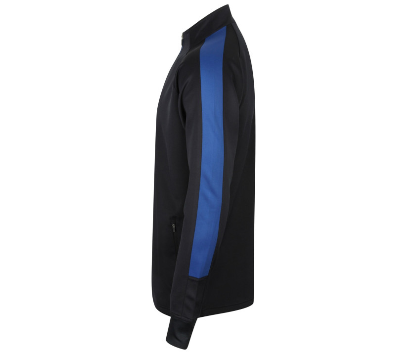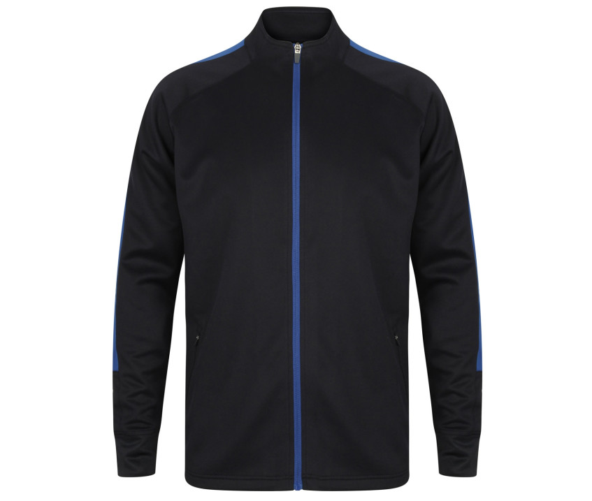 Veste grand zip contrasté. Bandes contrastées épaules et manches. Poches latérales zippées. Poignets en bords côte 1x1. Col cheminée.