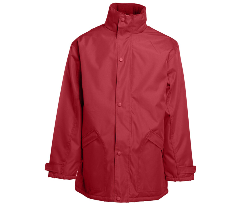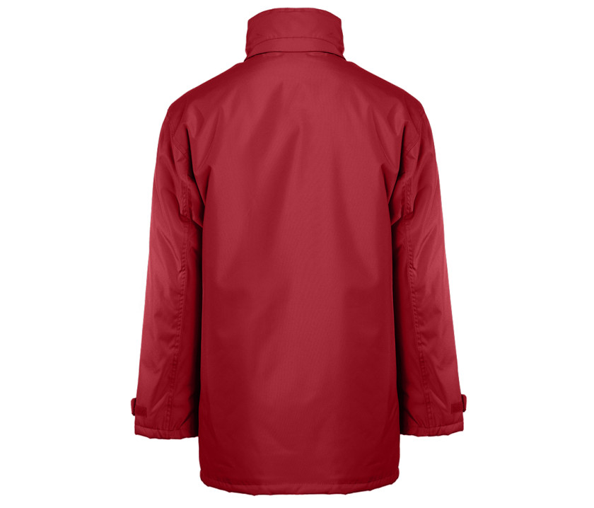 Coupe-vent avec enduction imperméable 1000mm. Col doublé polaire. Velcro® aux manches. 2 poches extérieures zippées. 2 poches intérieures (portefeuille et GSM). Capuche dans le col. Accès pour personnalisation (cœur et dos).