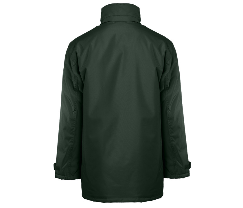 Coupe-vent avec enduction imperméable 1000mm. Col doublé polaire. Velcro® aux manches. 2 poches extérieures zippées. 2 poches intérieures (portefeuille et GSM). Capuche dans le col. Accès pour personnalisation (cœur et dos).