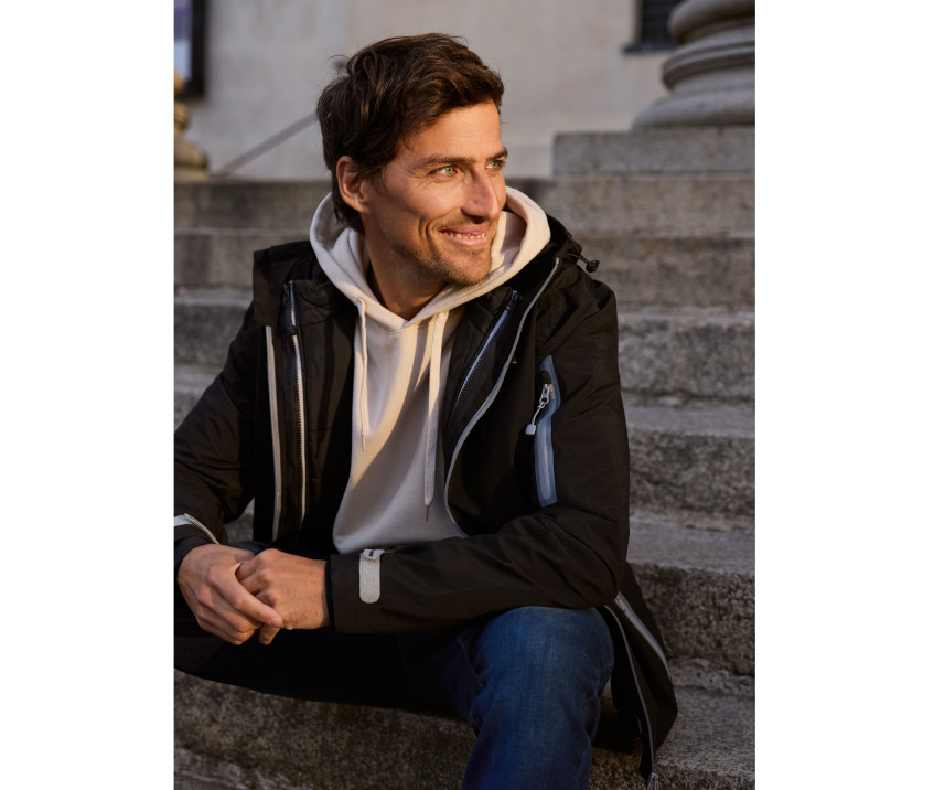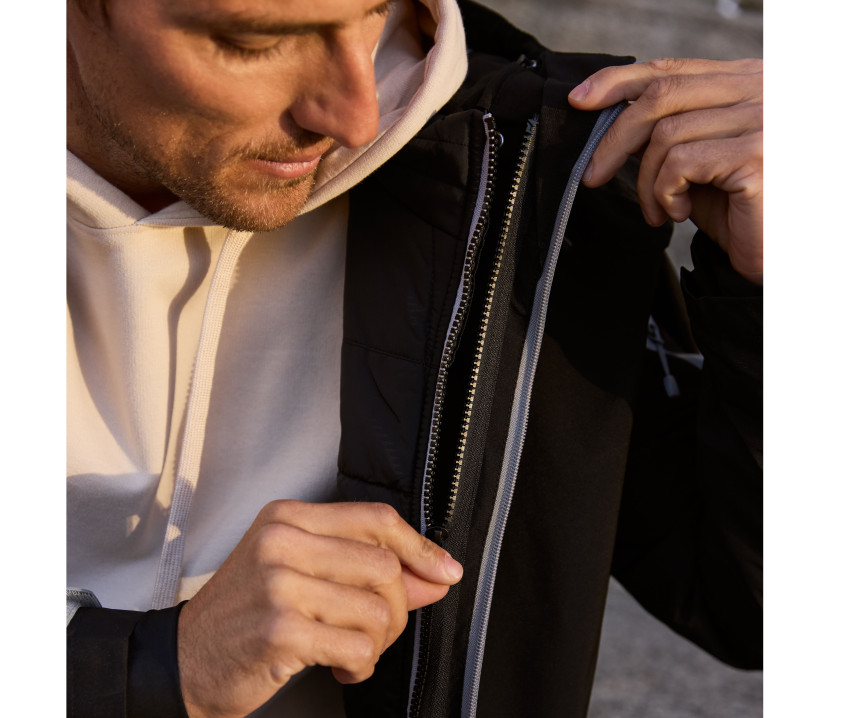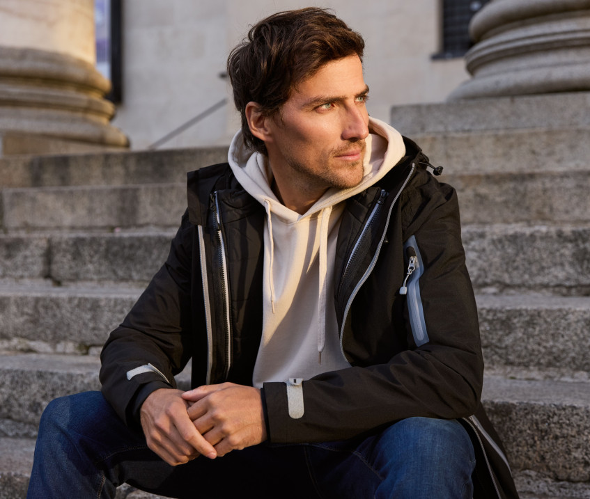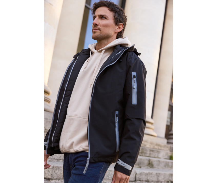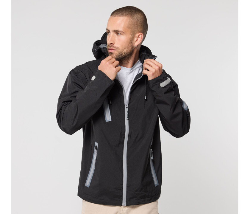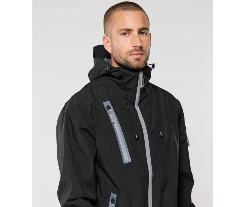 - Tissu contrecollé avec membrane respirante 3000 g/m² par 24 heures et imperméable à 8000mm. Coutures thermo-soudées. Possibilité de 3 en 1 avec le bodywarmer Réf. PK310.