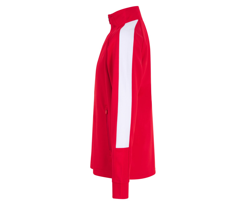Veste grand zip contrasté. Bandes contrastées épaules et manches. Poches latérales zippées. Poignets en bords côte 1x1. Col cheminée.