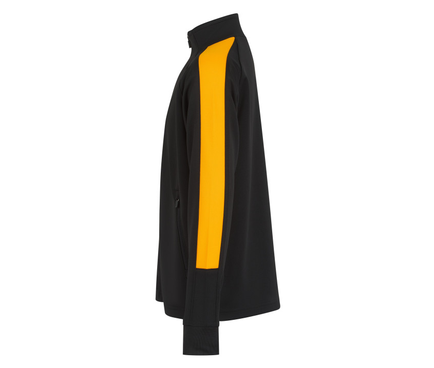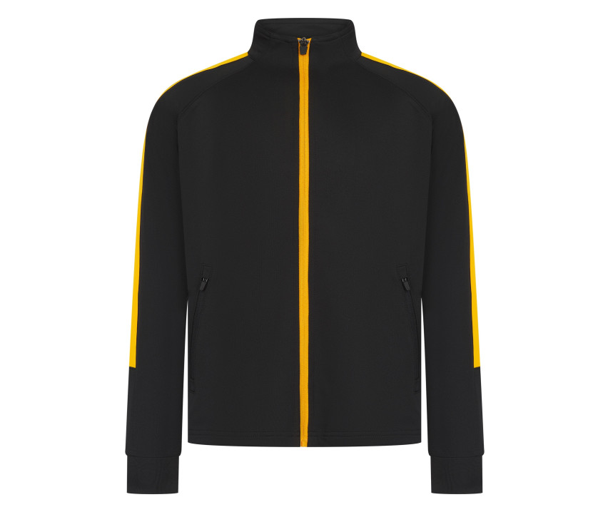Veste grand zip contrasté. Bandes contrastées épaules et manches. Poches latérales zippées. Poignets en bords côte 1x1. Col cheminée.