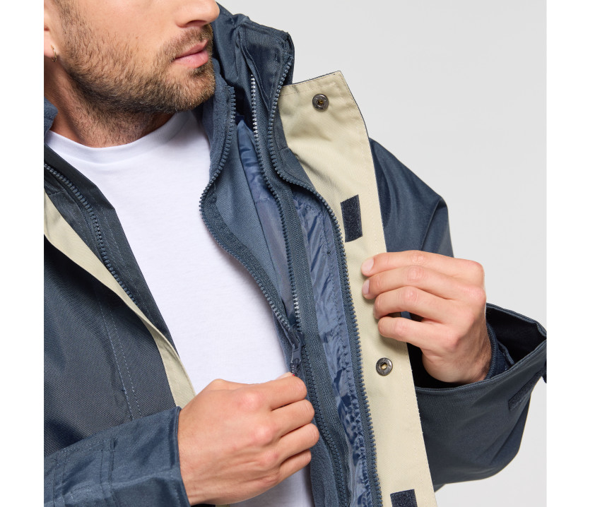 Parka 3 en 1 avec veste polaire amovible. Coupe-vent et imperméable. Capuche triple réglage dans le col. Fermeture zippée avec double rabat. Poches latérales zippées. 2 poches zippées. Veste intérieure détachable : polaire anti-peluche 280 g/m², 2 poches. Velcro® aux manches. Serrage à la taille. Accès pour personnalisation.