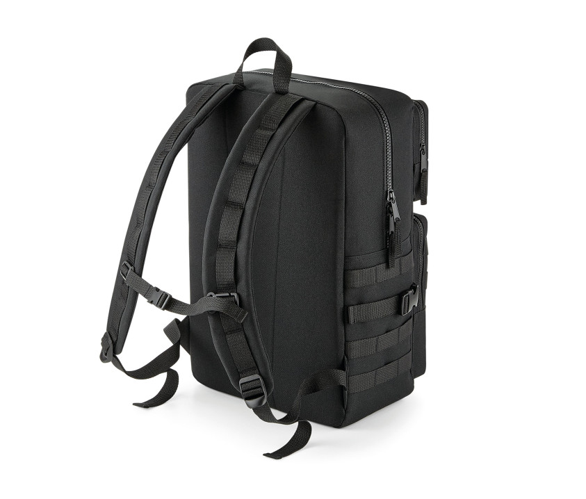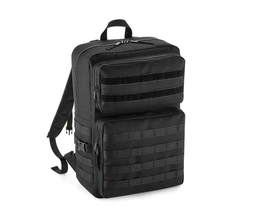 Étiquette détachable. Style militaire. Sangles MOLLE en Rip-Strip™. Boucles pour sangles MOLLE. 2 grandes poches avant zippées. Compartiment principal zippé. Poche intérieure. Poignée de transport. Dos renforcé. Sangles de compression. Bretelles matelassées ajustables. À associer à l'empiècement MOLLE BG840 et aux sacoches Modulr™ BG241 and BG242. Surface d'impression : 9x6cm.