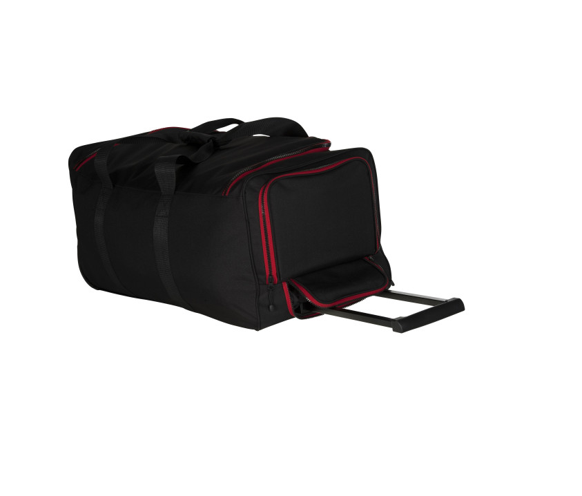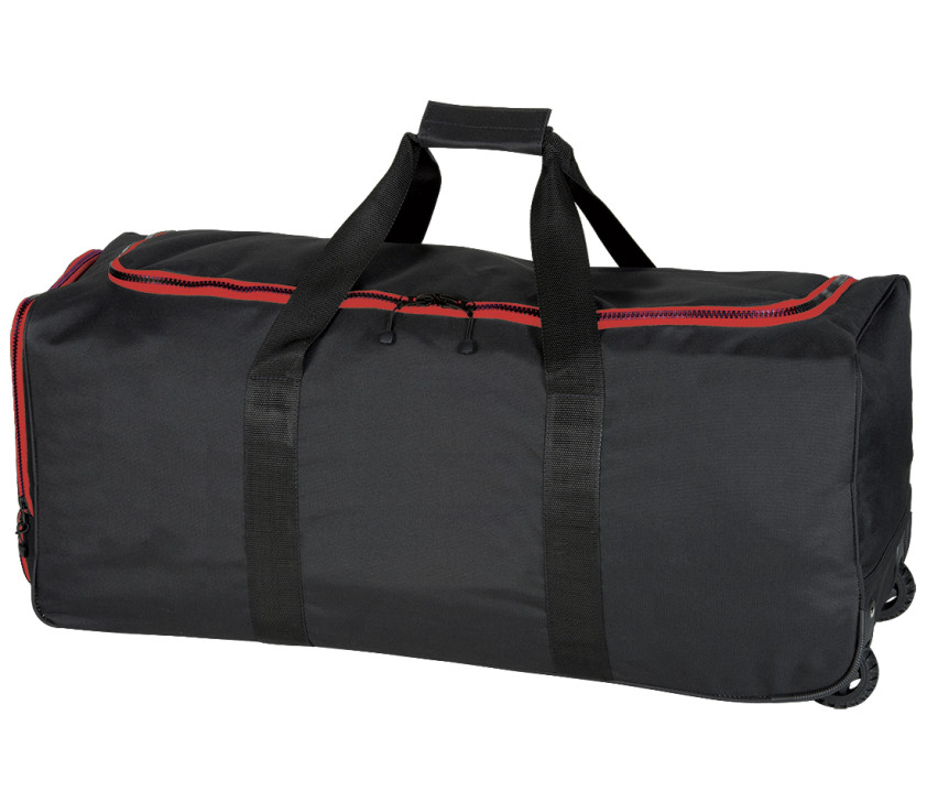 Grand sac de voyage à roulettes. Poignée télescopique. 2 anses. Poche latérale et poche centrale en forme de U. Zips contrastés. Surfaces d'impression avant : 16x12cm et côtés : 16x18cm.