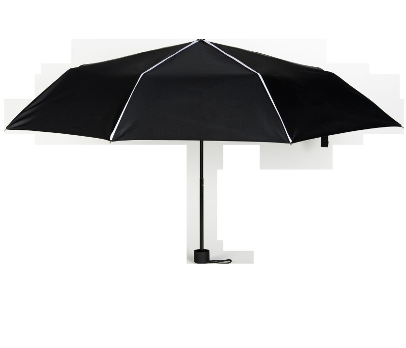Mini parapluie pliable en 3 dans sa housse de rangement. Fermé : 24cm, ouvert : 99cm.