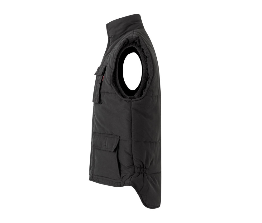 Bodywarmer matelassé. Rabat central avec boutons-pression. Taille élastiquée. Empiècement coupe-vent aux emmanchures. 7 poches : 2 poches poitrine avec rabat et Velcro® dont 1 avec compartiment pour stylos, 2 poches frontales avec rabat et Velcro® et en dessous de chacune 2 poches latérales, 1 poche intérieure.