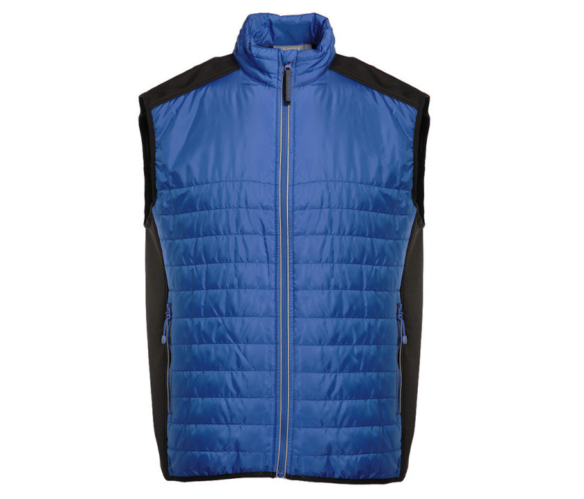 Bodywarmer bi-matière déperlant et coupe-vent. Coupe et look moderne. Accès marquage cœur. 2 poches zippées latérales. Ourlet réfléchissant sur les zips. Dos entièrement noir.
